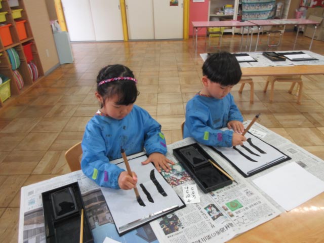 上手に練習できたら、いよいよ筆を持って墨をつけて、「書き始めてくださーい!」と声を掛けられるとすらすらと自分で上手に書き始めることができましたみんなとっても上手