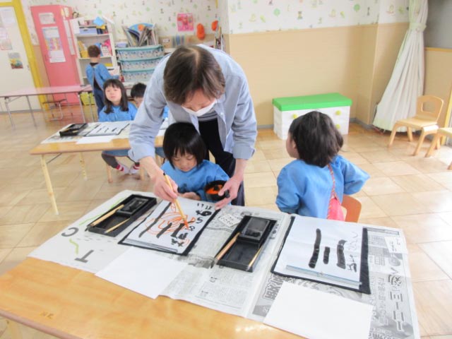 名前を書くのも難しいけれど、先生に一緒に筆を持ってもらって書くことができ、みんな嬉しそう