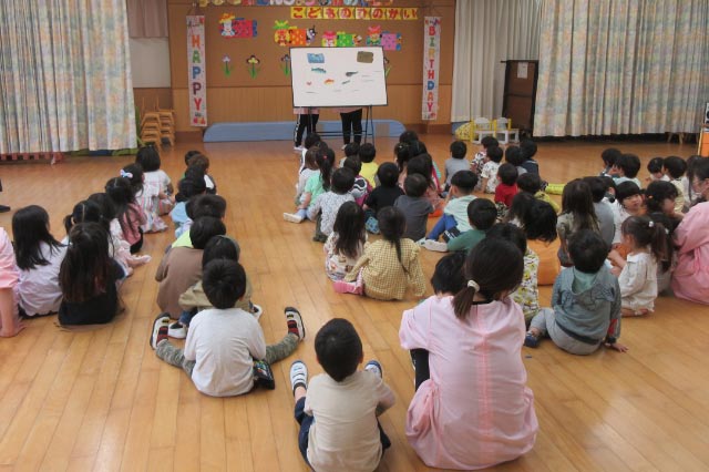 園長先生のお話をしっかり聞いて、みんなとってもおりこうさんです