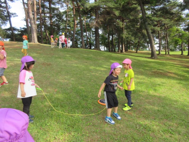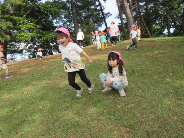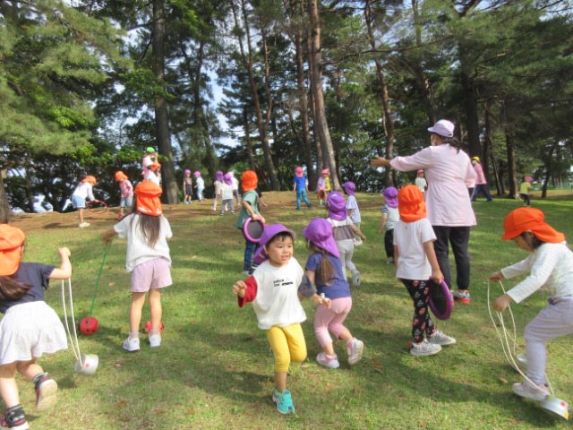 2025年6月2日 / 最終更新日 : 2025年10月3日 kataoka 行事のアルバム 公園の芝生に遊びに行きました 過ごしやすい日の午後は公園の芝生に保育園のオモチャを持って行って遊んでいます お山の上まで競争だーと勢いよくお山に駆け上って行く子ども達 みんな元気いっぱい喜んで体を動かしました フリスビーや缶ぽっくりに挑戦したり、みんなで追いかけっこをしたりとみんな大喜び お山の上から駆け下りてくるのがとっても楽しいね あやめぐみの子どもたちも縄跳びやボール投げをしてにっこにこ「また行きたーい」と喜んでいました