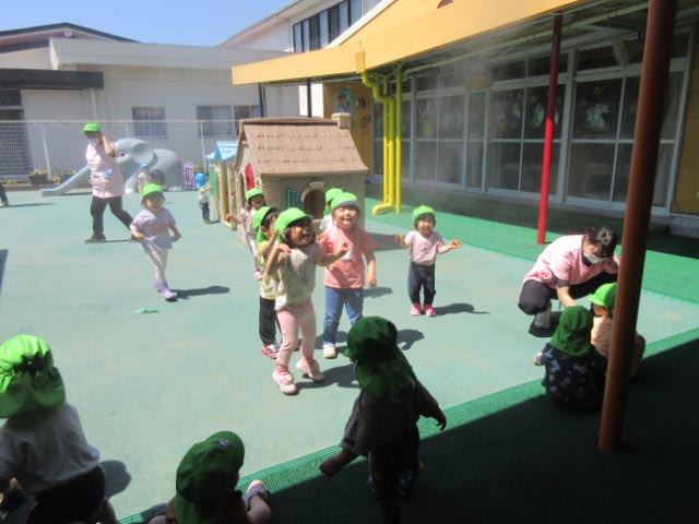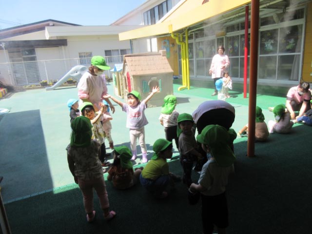 霧の中でお友だちと手をつないで歩いたり、くるくる回ってみたりと、それぞれが思い思いに楽しむ姿がとってもかわいくて、先生たちもにこにこ