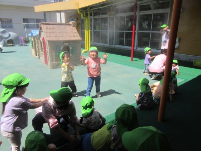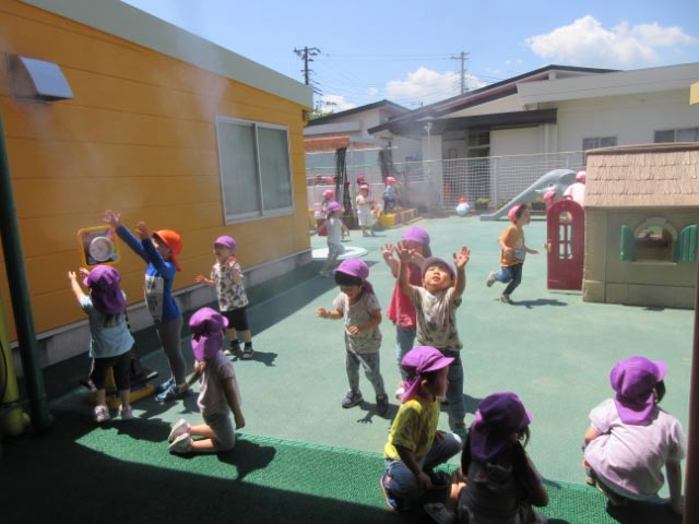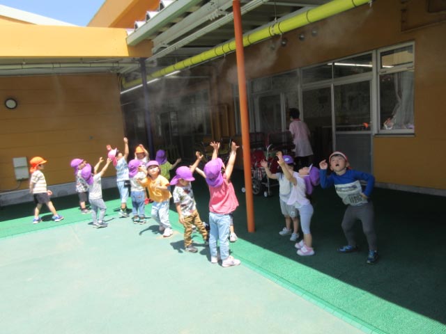 涼しく遊べるように、今年の初ミスト稼働日となりました霧のシャワーに、子どもたちは大喜び