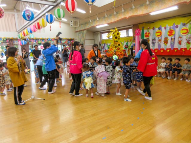 「はくちょう音頭」「いちはら踊り」「スマイル音頭」の3曲を、元気いっぱいに踊りました。手を大きく広げたり、くるっと回ったり、覚えた振りを思い出しながら一生懸命踊る姿に、たくさんの拍手が送られました![]()