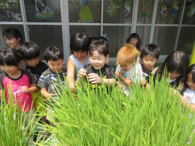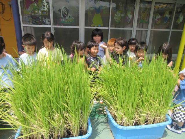 ひまわりぐみの子どもたちも稲を触り、「ほんとだーお花が咲いてるー」「かわいい」と近くで観察していました