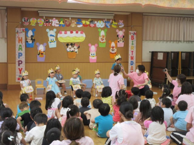 8月生まれのお誕生日のお友達、冠をかぶってニコニコとっても嬉しそう![]()
