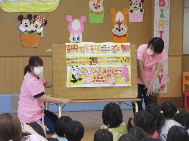 なんと、先生たちが手作りした大型絵本『パンどろぼう』の読み聞かせです![]()