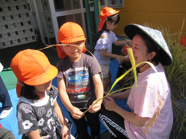 今日は、ひまわり組さんが育てたお米の稲刈りを行いました!