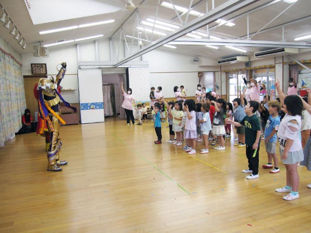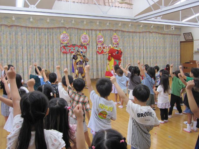 ヤツルギとトマ太郎の動きに合わせて、手を振ったりジャンプしたり、お遊戯室には、子どもたちの楽しそうな笑い声が響き渡りました![]()