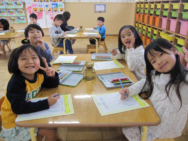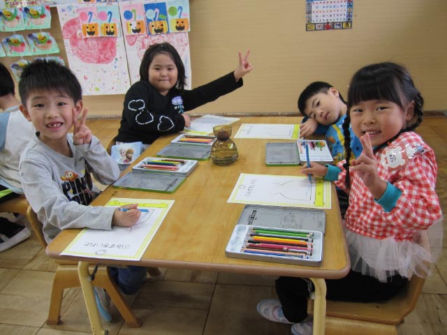 『どんな色のお花が咲くのかなぁ』『紫のお花だったらいいなぁ』と、思いをふくらませながら、にこにこと楽しそうに描く姿がとてもかわいい子どもたち![]()